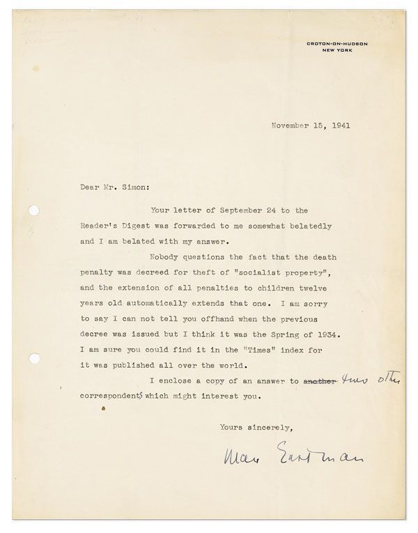 Nobody questions the fact that the death penalty was decreed for theft of “socialist property”, and the extension of all penalties to children twelve years old automatically extends that one.1 I am sorry to say that I can not tell you offhand when the previous decree was issued but I think it was the Spring of 1934. I am sure you could find it in the “Times” index for it was published all over the world.