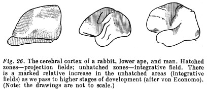 The rise and development of a perceptive psyche... were governed by several essential anatomical and physiological changes. The main one was the development and change of role of distant sense organs (i.e. ones operating at a distance), primarily of vision. Their development was expressed in an alteration both of their significance in the general system of activity and in the form of their anatomical interconnections with the central nervous apparatus. Whereas differentiation of sense organs in the preceding stage of evolution had led to the singling out of dominant organs among them, among vertebrates the leading organs more and more became those that integrate external influences. That became possible because of the simultaneously occurring restructuring of the central nervous system and the formation of a forebrain, and then of a cerebral cortex (for the first time in reptiles). Originally (among fish, amphibians, and reptiles) the forebrain was a purely olfactory formation constituting a sort of continuation of their central olfactory apparatus. In subsequent evolution (among [p. 177] [p. 178] mammals) the importance of the olfactory centres in the cerebral cortex was greatly reduced through the representation of other sense organs. This is clearly seen when we compare the place occupied by the olfactory cortex... in a hedgehog (Fig. 22) and a monkey (Fig. 23).