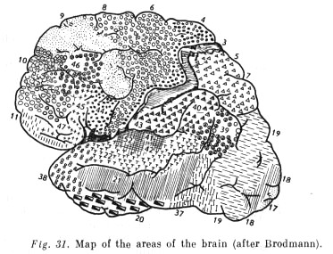 New areas of the cortex, not fully differentiated in the brain of apes, which later achieved full development in the brain of modern man, are already distinguishable in Neanderthal man, as casts of the inner surface of his skull indicate. Such are the areas numbered 44, 45, and 46 in Brodmann's system, in the frontal lobe, areas 39 and 40 in the parietal lobe, and areas 41 and 42 in the temporal lobe (see Fig. 31).