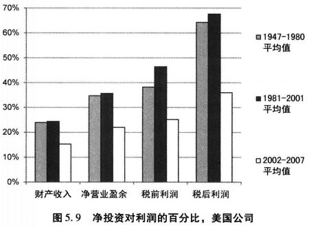 换句话说,美国公司正在进行的投资所需要的税后利润超出了它们实际获得的税后利润。由于股息仍在继续支付,这意味着公司正在耗尽它们提留的、用于替换和维持其实物资本的资金。这种情况显然是不可持续的,所以,自1983年起,用于积累的利润份额开始显著下降。但重要的一点是它回落到了正常水平。自1983至2001年期间,净投资平均等于税后利润的64%,远高于1947至1972年期间的平均水平(57%),略高于1947至1978年期间的平均水平(61%)。[16]
