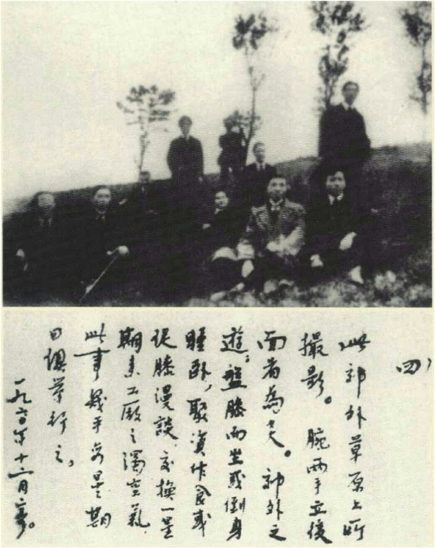 此郊外草原上所摄影。腕两手立后面者为炎。郊外之游:盘膝而坐或倒身睡卧,聚资作食或促膝漫谈,交换一星期来工厂之浊空气,此事几乎每星期日俱进行之。