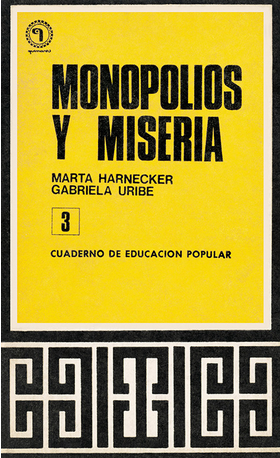 Monopolios y miseria Autor: Marta Harnecker &Gabriela Uribe Fecha: enero 1972 Colección: Cuadernos de Educación Popular. Número 3 Editorial: Departamento de Ediciones Especiales, División Editorial, Empresa Editora Nacional Quimantú Ltda., Chile |