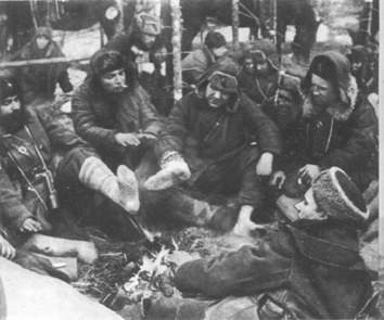 Después del combate los guerrilleros se reúnen en torno a una hoguera
