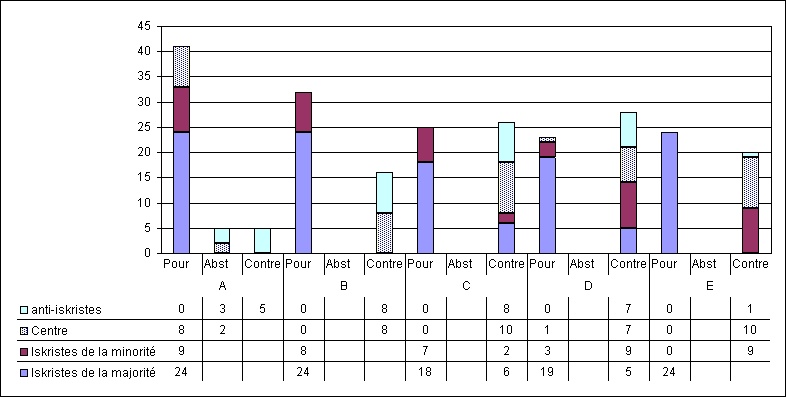 Le premier type de votes (A) englobe les cas où le « centre » a marché avec les iskristes contre les anti‑iskristes ou une partie d'entre eux. Il comprend le vote sur le programme dans son ensemble (seul Akimov s'est abstenu, les autres étaient pour), le vote sur la résolution de principe condamnant la fédération (tous, à l'exception de cinq bundistes, ont voté pour), le vote sur le paragraphe 2 des statuts du Bund (cinq bundistes contre nous, cinq abstentions : Martynov, Akimov, Brucker et Makhov, ce dernier avec deux voix; les autres avec nous); c'est ce vote qui figure dans le diagramme A. Ensuite, les trois votes sur la proposition confirmant l'Iskra organe central du Parti étaient aussi du même type; la rédaction (cinq voix) s'est abstenue; lors des trois votes, deux furent contre (Akimov et Brucker); en outre, lors du vote des motifs de confirmation de l'Iskra, cinq bundistes et Martynov s'abstinrent [1].