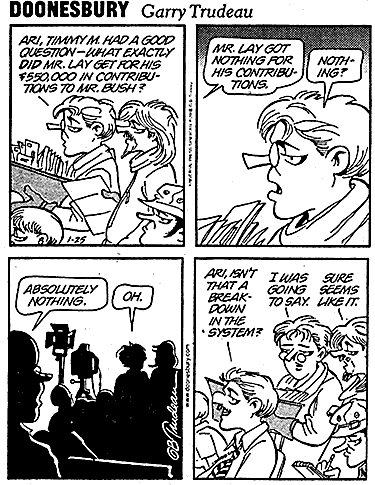 February 2002 Vol 2, No. 2 Enron: By Nat Weinstein Click on graphics for full-size image The collapse of Enron, which had been described as the countrys seventh largest and most powerful energy trading company is much more than just the biggest corporate bankruptcy in the nations history. It may also be one of historys big swindles, costing its mostly small-time shareholders billions of dollars as its stocks fell from a high of 90 dollars to less than 1 dollar a share. But most of all, as we shall see, it is symptomatic of the deepening global economic crisis. Enrons collapse will also contribute to the crisis. It added tens of thousands of jobless to the growing army of unemployed and reduced their retirement plansstuffed with Enron stockto a fraction of their former value. Meanwhile the handful of Enrons corporate insiders and big-time stockholders systematically sold off the bulk of their stocks in small blocks while assuring all that the corporations economic future was bright and its stock would resume its rise. The mass media has been reporting new evidence almost daily of the complicity of public and private agencies with Enrons criminal activity. The following are just a couple of the many instances of complicity by the government guardians of the “rule of law” over corporate America. The Jan. 17 New York Times reported that Harvey L. Pitt, the chairman of the Securities and Exchange Commission, who is responsible for policing companies like Enron, was reported to have paid a visit on Jan. 14 to senior executives in charge of the Financial Accounting Standards Board, the accounting industrys private-sector oversight body. According to one official present, Mr. Pitt reportedly “read them the riot act” for moving too slowly in adopting new standards particularly involving bookkeeping treatment of “special purpose entities”the murky partnerships at the center of the unraveling of the Enron corporation. The Times gave this account of Pitts hypocritical “scolding” of his underlings: Such a lecture from the head of the commission would be unremarkable but for one fact: For months leading up to the Enron debacle, Mr. Pitt, a former lawyer who has had most of the accounting industrys top players as clients, has been preaching the message that the commission under his predecessor was too adversarial toward the industry and needed to work more cooperatively with accounting firms. The Jan. 19 edition of the same newspaper reported that when a former chairman of the S.E.C., Arthur Levitt, attempted to regulate conflicts of interest in the accounting industry, his efforts were scuttled by “10 or 11 senators” and other influential persons who rained a torrent of threats down on his head. It was also reported that no fewer than “71 senators and 188 congressmen have been on the Enron gravy train. All but 5 of the 56 members of another investigative committee, House Energy and Commerce, got Enron or Arthur Andersen dough. The countrys chief law enforcement officer, John Ashcroft, has recused himself from the case because he too received Enron Cash .” The criminal character of the capitalist profit system The collapse of Enron is, among other things, an indictment of the criminal character of the profit motive and the capitalist economic system. The corporate-owned and controlled mass media of communicationotherwise known as the “free press”now blames this latest high-rolling rip-off on “greedy corporate executives.” But its hard to take this denunciation of Enron seriously, since the entire capitalist economic system is motivated by unmitigated greed. Goods and services are produced, not in order to satisfy human needs and wants, but in order to make as large a profit as possible. And so long as theres a profit to be made, all sorts of anti-social products, including such things as poison gas, atomic bombs and other weapons of mass destruction, are cheerfully and profitably produced. Make no mistake; the current exposé of the scandalous activities of Enron by the powers-that-be, is not motivated by their outrage at the terrible damage done to its workers or even to the large number of its small stockholders. Rather, its because by going through the motions of a criminal investigation, the reality of their complicity might be somewhat easier to deny. Neither is the reference to ethics anything but pure hogwash. The fact is that the laws governing big business are written and interpreted in such a way as to make “legal” what would be criminal if committed by private citizens without powerful friends beholden to them in high places. After all, its an open secret that laws regulating corporations are so riddled with loopholes that capitalists easily slip through without a scratch. And if past practice is any guide, it is highly unlikely that any of the real perpetrators responsible for these “unethical” activities will serve any time in prison. And even if the cabal of regulators and regulated are compelled to throw one or more of their own to the wolves, those convicted of grand larcenyits safe to saywill not be made to serve as much time as would a poor ghetto-dweller convicted of shoplifting. The significance of Enrons bankruptcy, however, is far surpassed by what it reveals about the nature of capitalist democracy on the one hand and, on the other, what it tells us about the currently deepening economic crisis in the capitalist world. First, we will take a look at the political significance of the Enron bankruptcy and the general malfeasance of public and private authorities assigned to regulate corporate America. Dollar democracy or whats good for big business is good for America The truth of the matter is that while the capitalist electoral and political system is democratic, it is like the democracy in ancient Greece and Rome, which was democracy for slave owners, not for the slaves. The American system, thus, would be better characterized as dollar dem