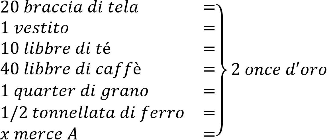 ├ ■(1 vestito&=@10 libbre di té&=@40 libbre di caffè&=@1 quarter di grano&=@2 once d'oro&=@1/2 tonnellata di ferro&=@x merce A &=@etc.merce&=)}20 braccia di tela
