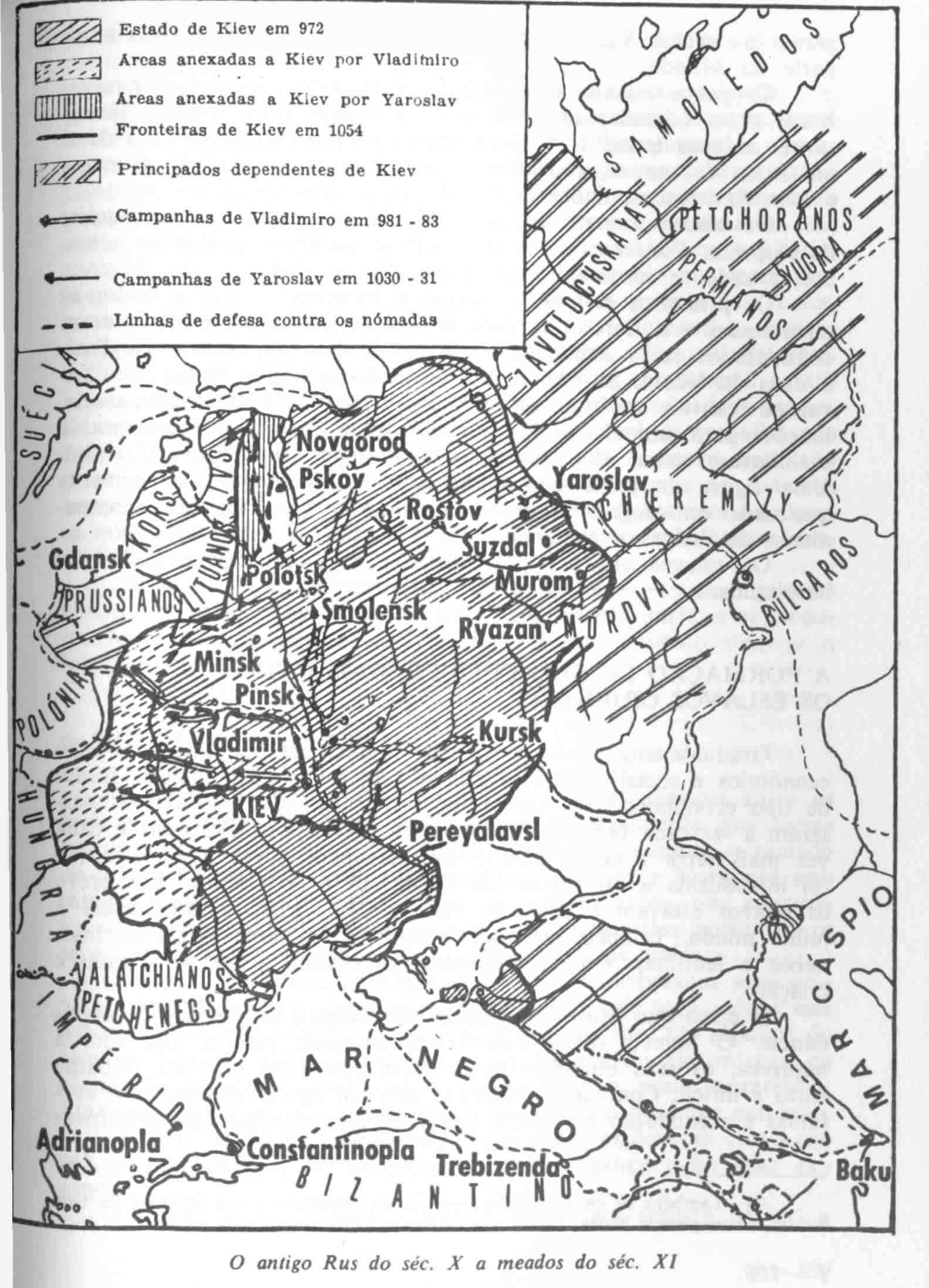 A pouco e pouco, o Estado de Rus alargou as suas fronteiras. O seu poder armado e a sua técnica militar veio a representar um desafio formidável. Svyatoslav (942 - 972) acrescentou muitas terras ao Estado de Rus e subjugou os vyatichi, os Búlgaros do Volga e o reino khazar. Também conquistou território búlgaro no vale do Danúbio.