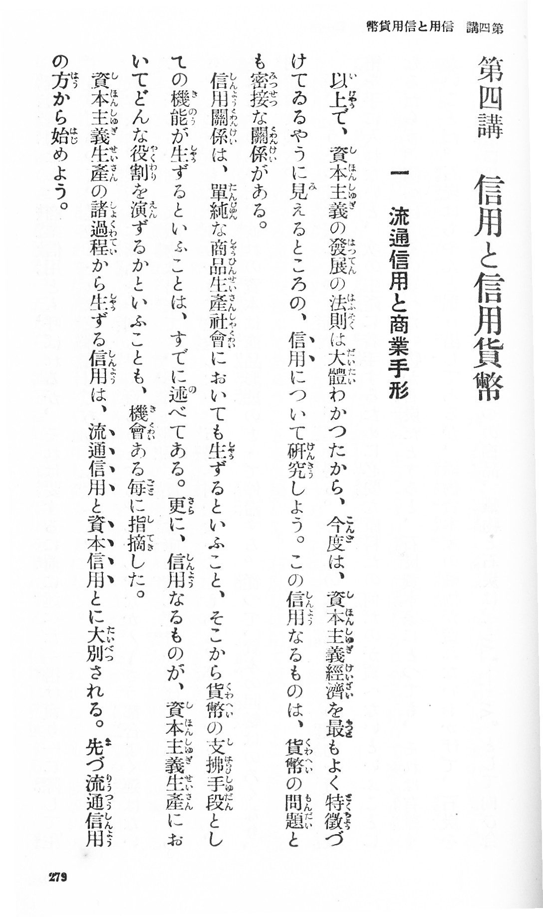 Those accepting banknotes from a bank first of all accept them as a certificate of trust. But it is because commercial bills and checks accepted as certificates of credit re-circulate to take the place of money, that banknotes also pass from hand to hand to re-circulate and take the place of money. The characteristics of banknotes, as an instrument of credit, is first that they do not have to be endorsed; second that there is no designated payment date, so that they can at any time be exchanged for gold coins; third that its denominations are not fractions but 1-yen, 5-yen, 10-yen, etc.; and fourth that one only has to deal with banks which have a great deal of trust. These are the reasons that banknotes can also enter general circulation to take the place of money. First and foremost, they can take the place of money in the function of means of circulation, and further, if the trust in the bank is not shaken, they can take the place of money in the function as means of payment.