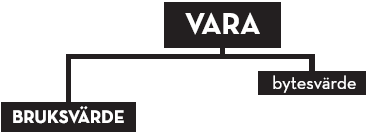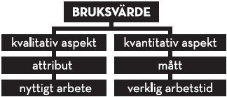 Marx börjar sin kritiska undersökning med att analysera varans två grundläggande egenskaper. Han påpekar att varje vara har en dubbelnatur. Den har både ett bruksvärde och ett bytesvärde. I första delen av figur 2 skildras det som: