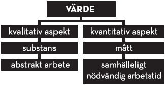 I Marx terminologi är dessa produkter av abstrakt arbete värden. Precis som varor är bruksvärden och bytesvärden när de har något gemensamt, är de också värden när de har ett värde. Men att säga att en vara har ett värde innebär inte en subjektiv värdering. Det innebär bara kort uttryckt att den är en produkt av abstrakt arbete och att den kommer att bytas. Ett annat sätt att uttrycka relationen mellan värde och abstrakt arbete är att säga att värdets substans är abstrakt arbete. Som vi kommer att se kan värdets kvantitet vara större eller mindre, men det är här fråga om måttet på dess väsentliga kvalitet eller substans: abstrakt arbete. På samma sätt kan värdets substans komma till mer eller mindre fullständigt uttryck genom olika former av bytesvärde. Dess form och mått är nödvändiga för värdet, men båda måste skiljas från substansen. Låt oss därför slå fast: att värdet är bytesvärdets kvalitativa aspekt innebär inte att det bara är fråga om en kvalitet. Abstrakt arbete är värdets essens - det som inte kan ändras med mindre än att begreppet går förlorat. Abstrakt arbete utgör substansen, eller essensen, av värdeformen: bytesvärde. Omvänt säger Marx att bytesvärdet är värdets fenomenella form (eller framträdelseform) - den form genom vilken värdet tar sig ett igenkännbart uttryck i kapitalet. Med andra ord: arbete har för kapitalet endast mening, och framträder som en samhällelig relation endast när det förkroppsligas i en produkt som utbyts (och som i bästa fall skapar mervärde).