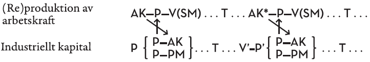 där V(SM) ... T representerar konsumtion som en del av arbetet att producera arbetskraften (AK*). Asterisken på AK* indikerar förändring. Trots det faktum att arbetet med att vara gravid och uppfostra ett barn ökar befolkningen, indikerar arbetet (till exempel hushållsarbete) i T fortfarande ett mindre värde per capita och därför är AK* < AK. Detta har en positiv inverkan på överskottet på grund av att nivån av variabelt kapital är lägre än den annars skulle ha varit. Kapitalets nya organisering av den sociala fabriken kan därför representeras genom följande diagram i vilket kretsloppen av industriellt kapital och av reproduktionen av arbetskraft är inbördes relaterade: