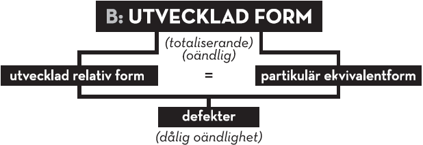 Sammanfattningsvis säger Marx att ett adekvat värdeuttryck inte bara måste representera samspelet mellan kapitalismens (oändliga antal) varor utan också göra det på så sätt att det teoretiska samspelet blir explicit. De enkla serier av ekvationer vi får i den utvecklade värderelationen gör inte detta. Sett från ekvationens båda perspektiv, får vi ofullbordade, fragmenterade och fristående serier. Detta gör att det universella samspel som ger upphov till abstrakt arbete inte framträder. I fråga om fragmenteringen ligger problemet i att i fallet xA = yB, xA = wC etc. har B och C ingen relation, och vi har inget unikt eller gemensamt uttryck för A. När det gäller värdets ofullbordade karaktär ligger problemet i att varje tillägg av nya varor förändrar dess uttryck. Eftersom det alltid kommer att uppstå nya varor (så länge kapitalismen expanderar) kommer serien alltid att vara ofullbordad, och ett enda uttryck för abstrakt arbete blir därmed omöjligt. Marx kritik av den utvecklade formen påminner om Hegels kritik av dålig oändlighet - en icke sammanlänkad, ändlös serie.