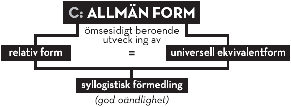 Den här formen är allmän, eller universell, i alla sina moment. Den relativa formen hos vilken vara som helst är universell, eftersom "varuvärlden [skapar] en enhetlig, allmän, relativ värdeform åt sig."[14] Det innebär att det relativa värdet hos alla varor uttrycks på samma sätt, med hjälp av samma ekvivalent. Ekvivalentformen är allmän, eftersom ekvivalenten har kommit att utgöra den unika form där alla andra varors värde uppenbarar sig. På grund av detta blir det arbete som producerat den också den universella formen för förverkligande av mänskligt arbete, det vill säga som universellt, eller abstrakt, arbete. Den allmänna ekvivalenten blir därför en symbol, eller representant, för precis den samhälleliga situation vi tidigare beskrev som upphovet till det abstrakta arbetet och varusamhället: kapitalet och dess klasstruktur. Även om den kallas allmän värdeform, och även om vi talar om en universell ekvivalent och en universell relativ värdeform, innebär detta på intet sätt att de interna motsättningar som karakteriserade de tidigare värdeformerna försvunnit i någon form av universell harmoni (vare sig i själva formen eller i varusamhället). De har tvärtom bevarats i nya former. Den enkla värdeformens irreversibla och motstridiga polaritet och reflexivitet finns kvar, precis som den utvecklade formens totaliserande och oändliga aspekter. Men nu har det alltså dessutom tillkommit en ny aspekt. Just eftersom den allmänna ekvivalenten blivit direkt utbytbar mot alla andra varor, medför detta att alla andra varor förlorat den egenskapen. De kan inte längre bytas direkt mot varandra utan måste först bytas mot den allmänna ekvivalenten.