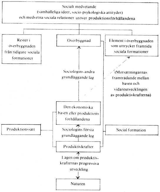 En social formation eller ett socialt system består av å ena sidan produktionssättet, å andra sidan överbyggnaden eller superstrukturen. I produktionssättet ingår produktivkrafter och produktionsförhållanden. Produktivkrafterna utgörs av produktionsmedlen, framför allt arbetsredskapen, samt den erfarenhet och förmåga varmed människorna hanterar dem. Produktionsförhållandena är relationerna mellan människorna inbördes i anknytning till produktionen, däribland arbetsfördelningen men framför allt egendomsförhållandena, ägandet av produktionsmedlen.