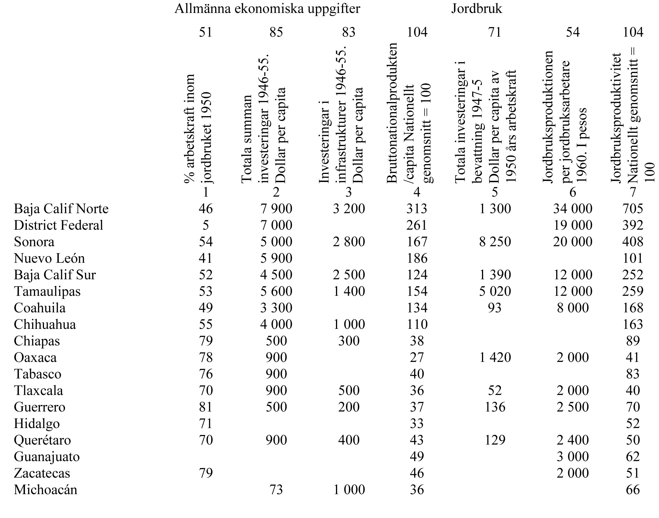 Källa: Paul L. Yates, El Desarollo Regional de México. Siffrorna högst upp hänvisar till Yates för varje kolumn.