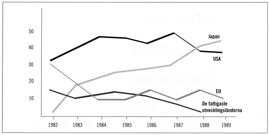 Diagram 2. Det cirkulerande kapitalets nationella ursprung (i % av världens totala). Källa: IMF, Balance of Payment, Statistics Yearbook, Washington D.C. 1991.